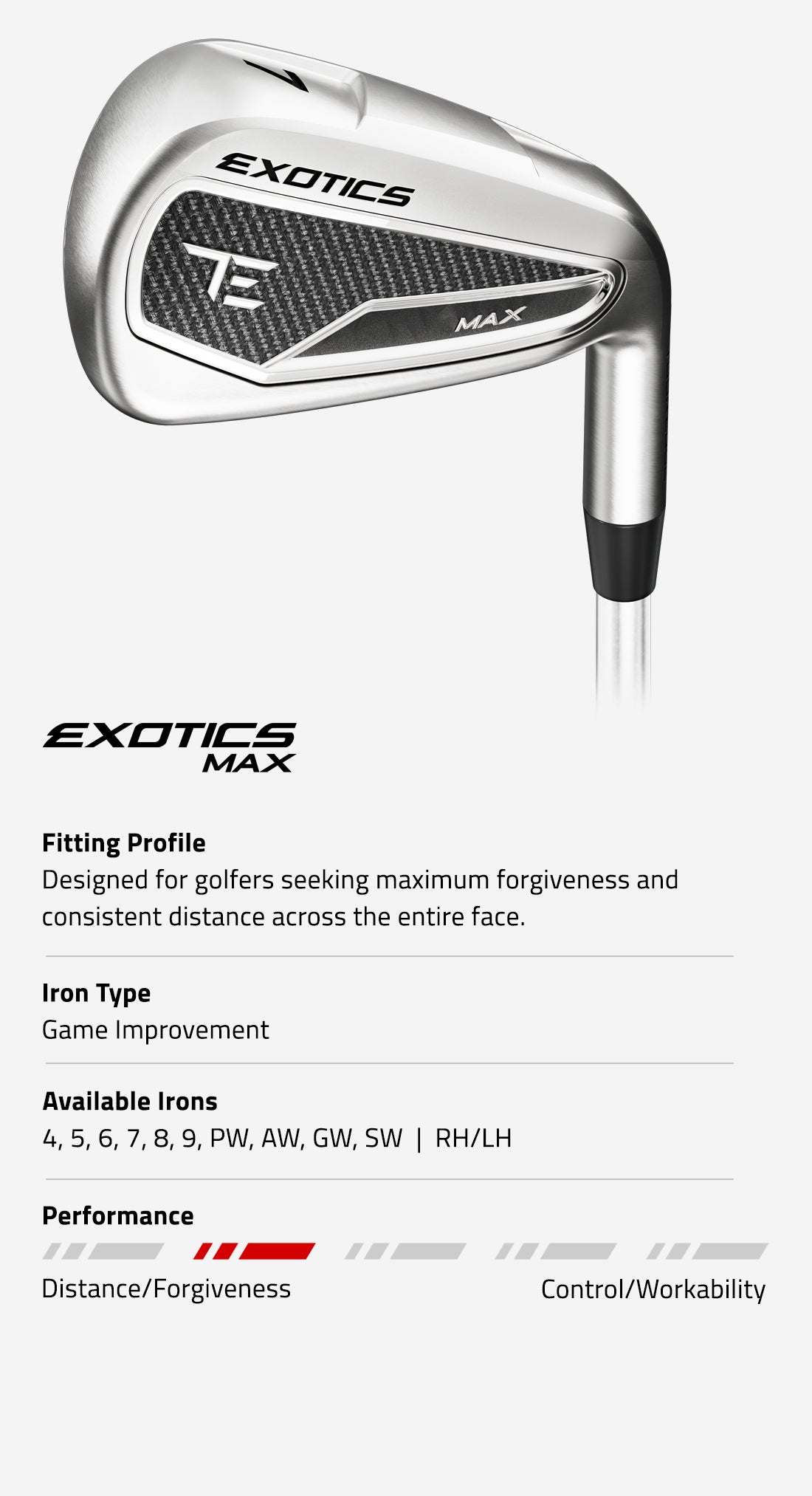 Distance is made easy with the all-new Exotics Max irons. Featuring a clean, confidence-inspiring look at address, this game-improvement design delivers higher launch, faster ball speeds, and the consistency and accuracy to help you hit more greens.