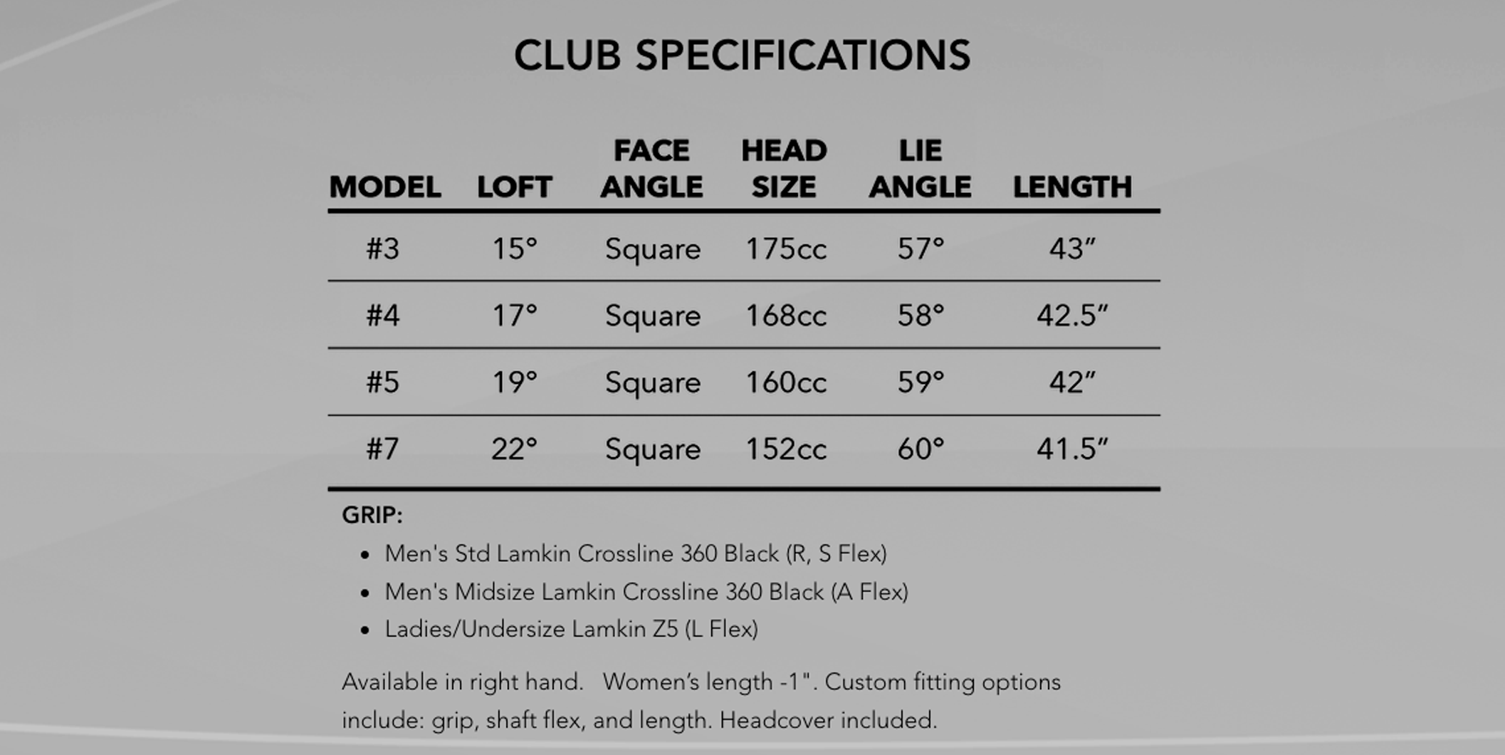 Hand/Loft: #3-15° (RH) | #4-17° (RH) | #5-19° (RH) | #7-22° (RH)