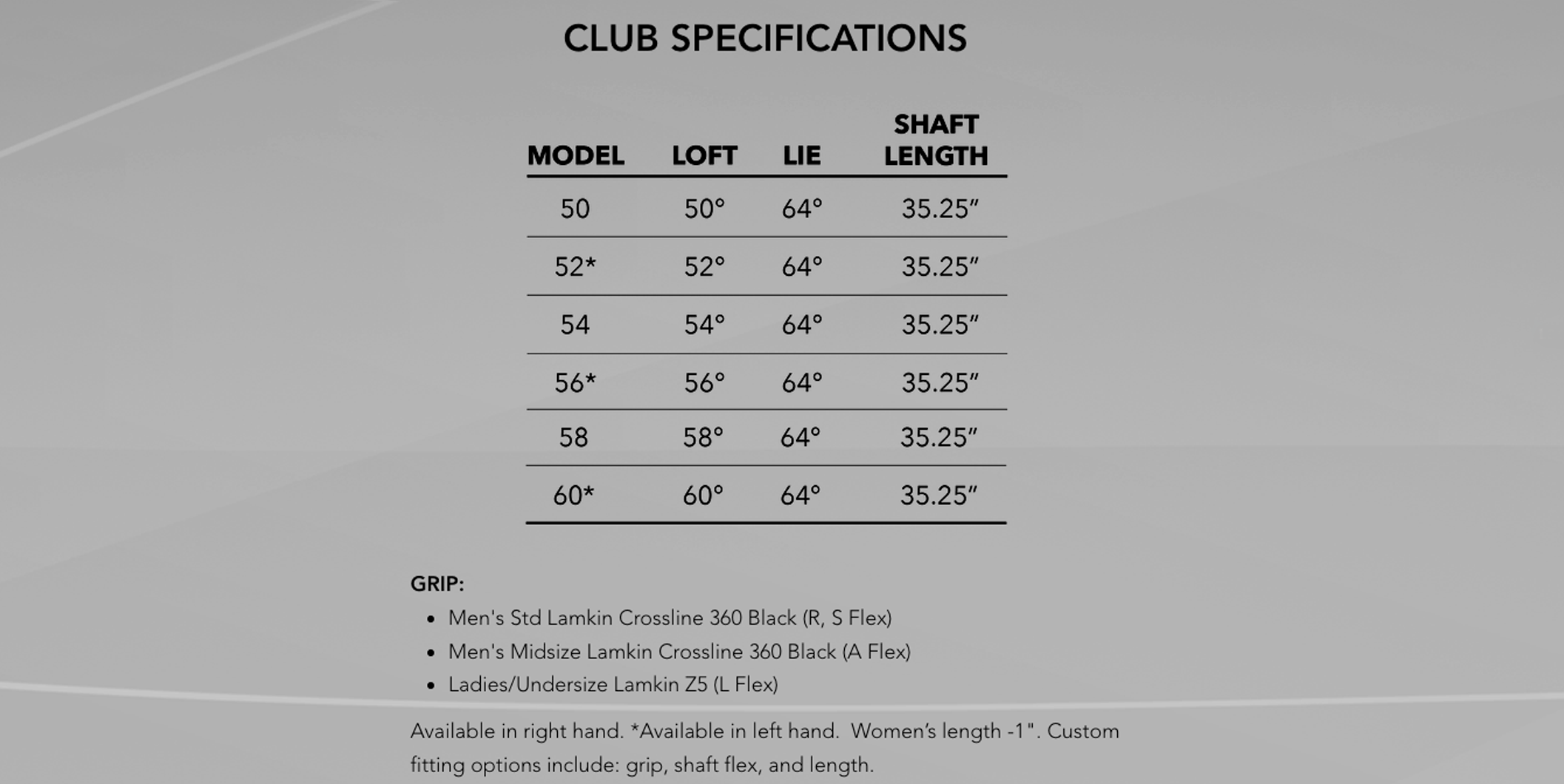 Hand/Loft: 50° (RH) | 52° (RH/LH) | 54° (RH) | 56° (RH/LH) |